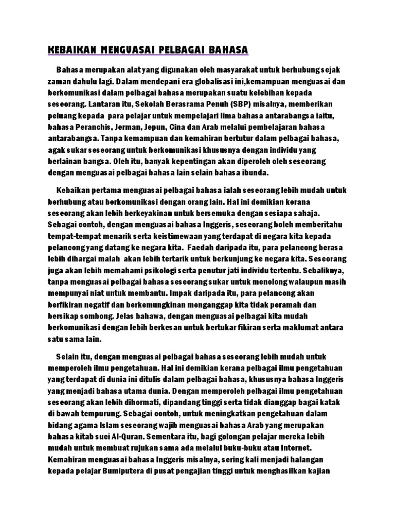 Barang siapa yang memahami kepentingan bahasa asing pasti akan bertindak segera. Persaingan antara masyarakat dalam pelbagai disiplin ilmu juga akan menjadi lebih mudah. 23) soalan contoh dalam era globalisasi ini, penguasaan ilmu dalam pelbagai bidang akan menentukan kejayaan seseorang itu. Dengan menjadikan bahasa melayu sebagai bahasa kebangsaan, kita dah boleh menguasai bahasa indonesia. Oleh itu, adinda perlu menguasai bahasa asing agar membantu adinda untuk berkomunikasi.