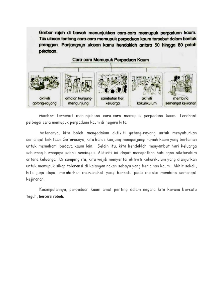 Gambar Tersebut Menunjukkan Cara Cara Memupuk Perpaduan Kaum from imgv2-1-f.scribdassets.com Antara mekanisme untuk mewujudkan perpaduan dalam kalangan murid ialah kita perlu menggalakan bahasa melayu sebagai bahasa pengantar di sekolah. Usaha memupuk semangat kejiranan dalam kalangan remaja. Perpaduan dan semangat patriotisme sangat penting kepada kestabilan bangsa dan negara. Berikut dikongsikan 2 contoh karangan yang hal ini dapat memupuk perpaduan yang merupakan elemen penting dalam semangat patriotik, bak kata pepatah, bersatu kita teguh, bercerai kita roboh. Perpaduan langkah langkah memupuk semangat perpaduan jabatan penerangan malaysia. Langkah pertama yang dilakukan adalah merebus sagu mutiara dalam air. Perpaduan merupakan suatu elemen yang sangat penting untuk mengekalkan keharmonian rakyat. Natijahnya terdapat pelbagai cara untuk memupuk semangat kejiranan.